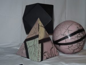 Na de biscuit stook kan je met schilders tape banen of figuren opzetten, overal waar tape zit blijft zwart .Dan kwast je het hele werkstuk een tussenlaag (3) als dit goed droog is, overgiet je je werk met een zogenaamde foute glazuur en laat dit ook drogen.